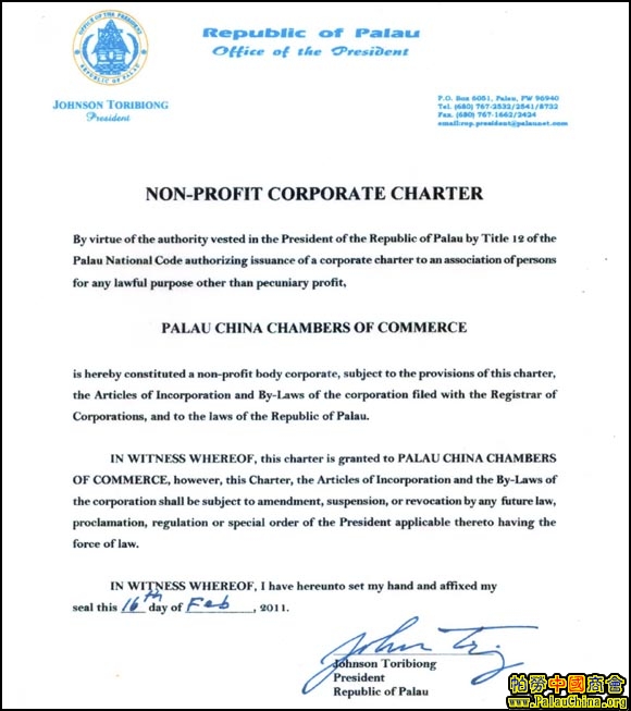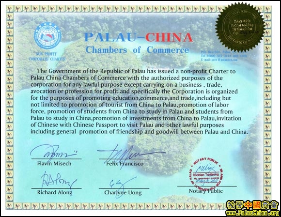 副会长 孔立群先生 黄勇先生 邹敦东先生 王萍女士 陈章贵先生 薛善之女士 秘书长 杨靖先生 副秘书长 关培勤先生 财务总监 陈明珍女士 法律顾问 陈唯真先生 顾问 严星如先生 ………………………………………… ● ………………………………………… 时任帕劳总统陶瑞宾先生阁下签署帕劳中国商会成立之核准书